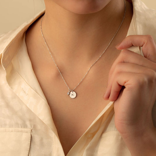 Personalized Initial Disc and Birthstone Necklace In Silver