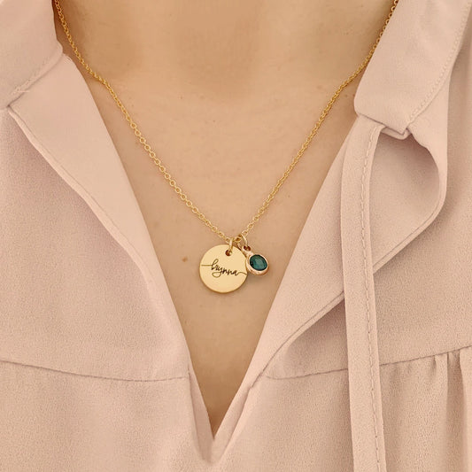 Personalized Initial Disc and Birthstone Necklace In Gold