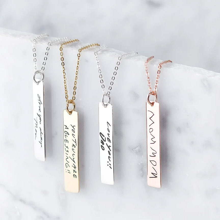 Wear your loved ones' actual handwriting close to your heart with our Actual Handwriting Vertical Bar Necklace. Keep their words and memories with you at all times. A unique and heartfelt way to express your love. Order now and cherish the moments forever!