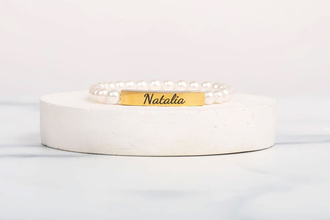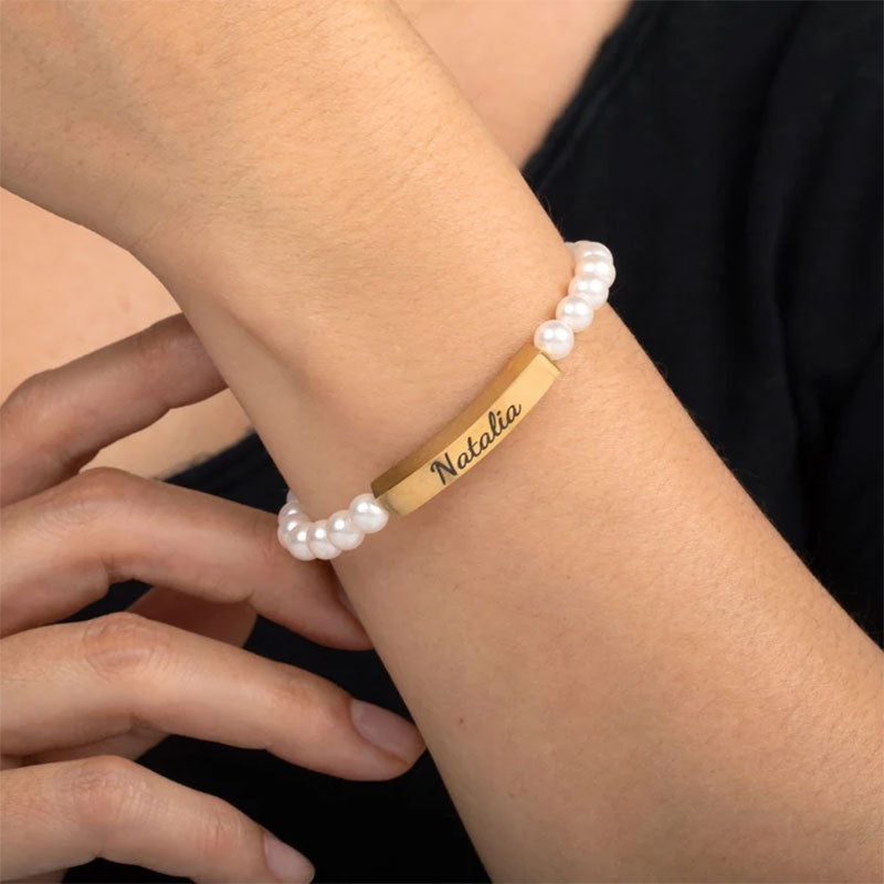 Experience timeless elegance with our Gold Bar Personalized Pearl Bracelet. Handcrafted with delicate pearls and a gold bar charm, this bracelet can be customized with any name or initials. Perfect for adding a personal touch to any outfit, it also makes for a unique and heartfelt gift. Make a statement with this luxurious and personalized accessory.