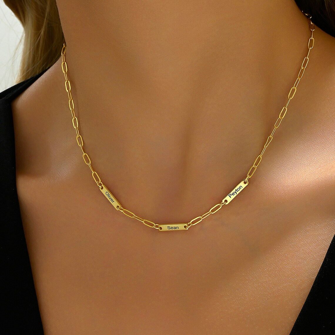This stunning necklace features a paperclip chain and three customizable name bars, making it the perfect way to show off your unique identity and add a personal touch to any outfit. Express yourself with this must-have accessory!