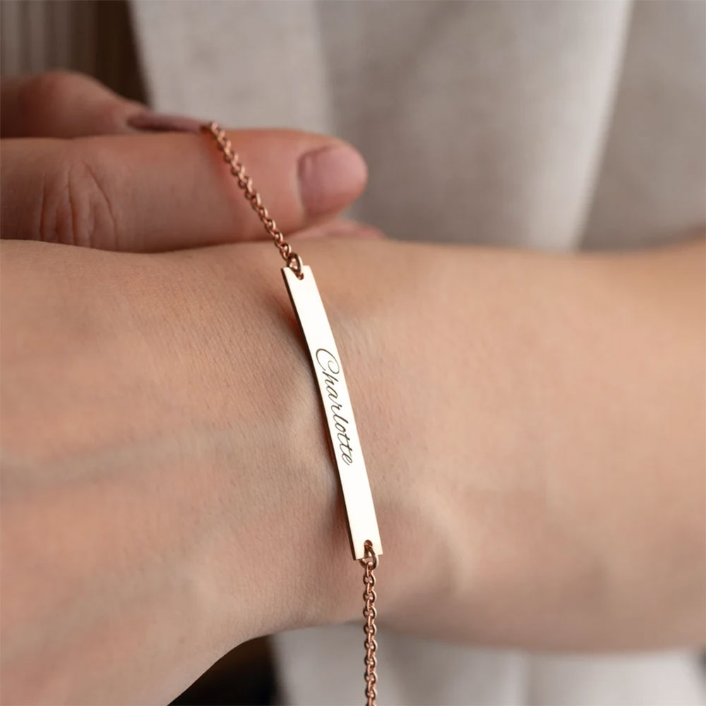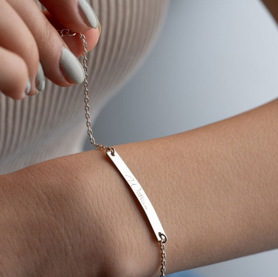 Get your hands on this one-of-a-kind Personalized Bar Bracelet in Silver! Made just for you, this bracelet is customizable with any name, date, or special message. Add a personal touch to your accessory collection and show off your unique style. Perfect for yourself or as a thoughtful gift for someone special. (Bar that up, baby!)