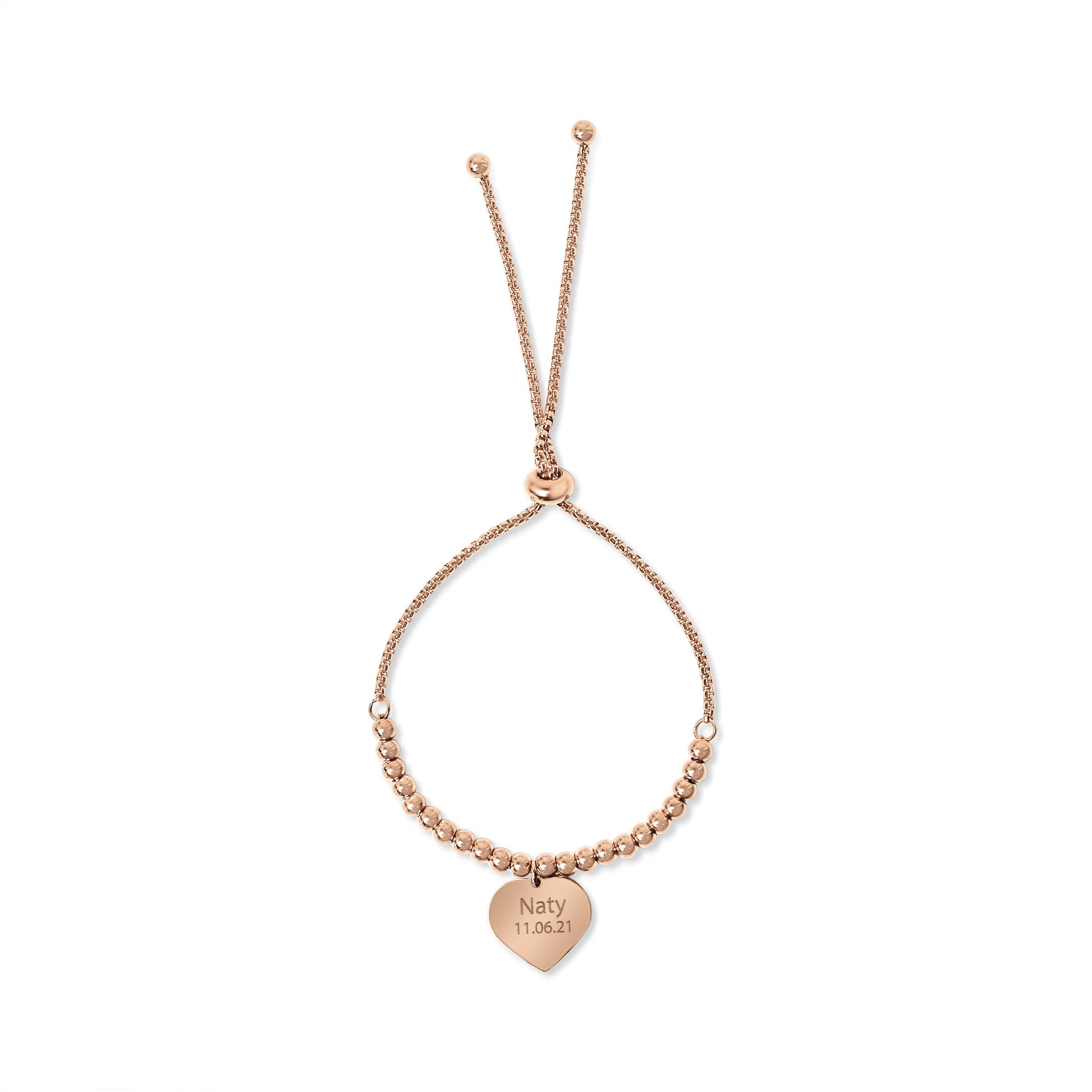 Fall in love with our Adjustable Personalized Beaded Bracelet in Rose Gold! Each bracelet is beautifully crafted with a heart pendant and personalized beads, making it a truly unique accessory. Express your love and style with this charming piece that is sure to catch everyone's eye. Perfect for any occasion, it's a heartfelt and stylish addition to any outfit.