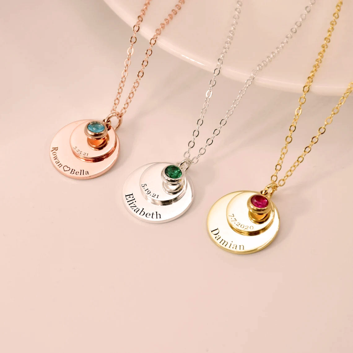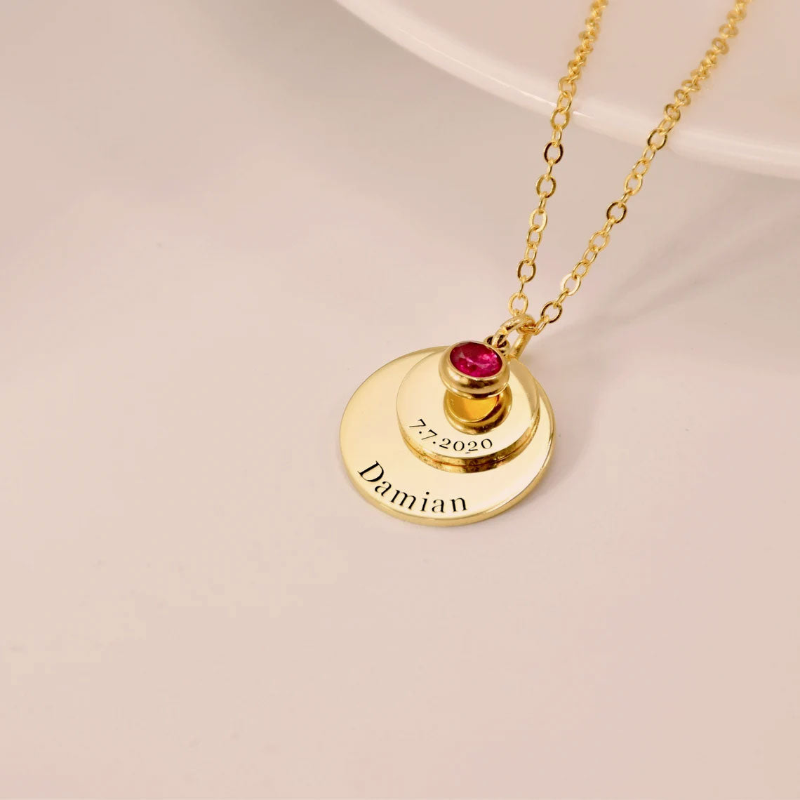 Our Personalized Double Disc and Birthstone Birthday Necklace. Featuring two customizable discs and a sparkling birthstone, this necklace is the perfect gift for a friend or family members special day. Handcrafted with the finest materials, this piece exudes elegance and sophistication. Elevate your style and make a statement with our exclusive necklace.
