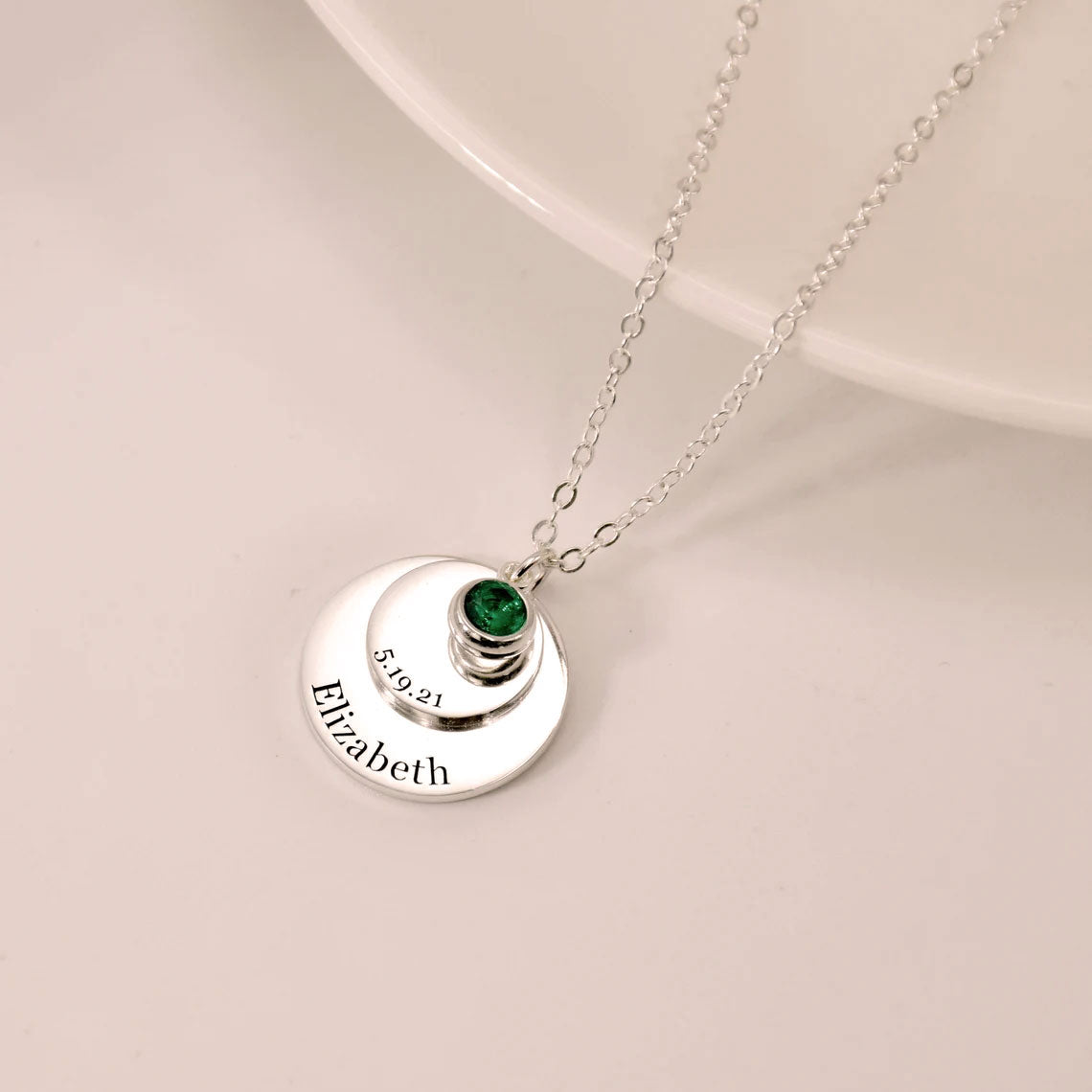- Two customizable round discs. A large 15mm disc engraved with her name and a smaller 8mm disc engraved with a date
