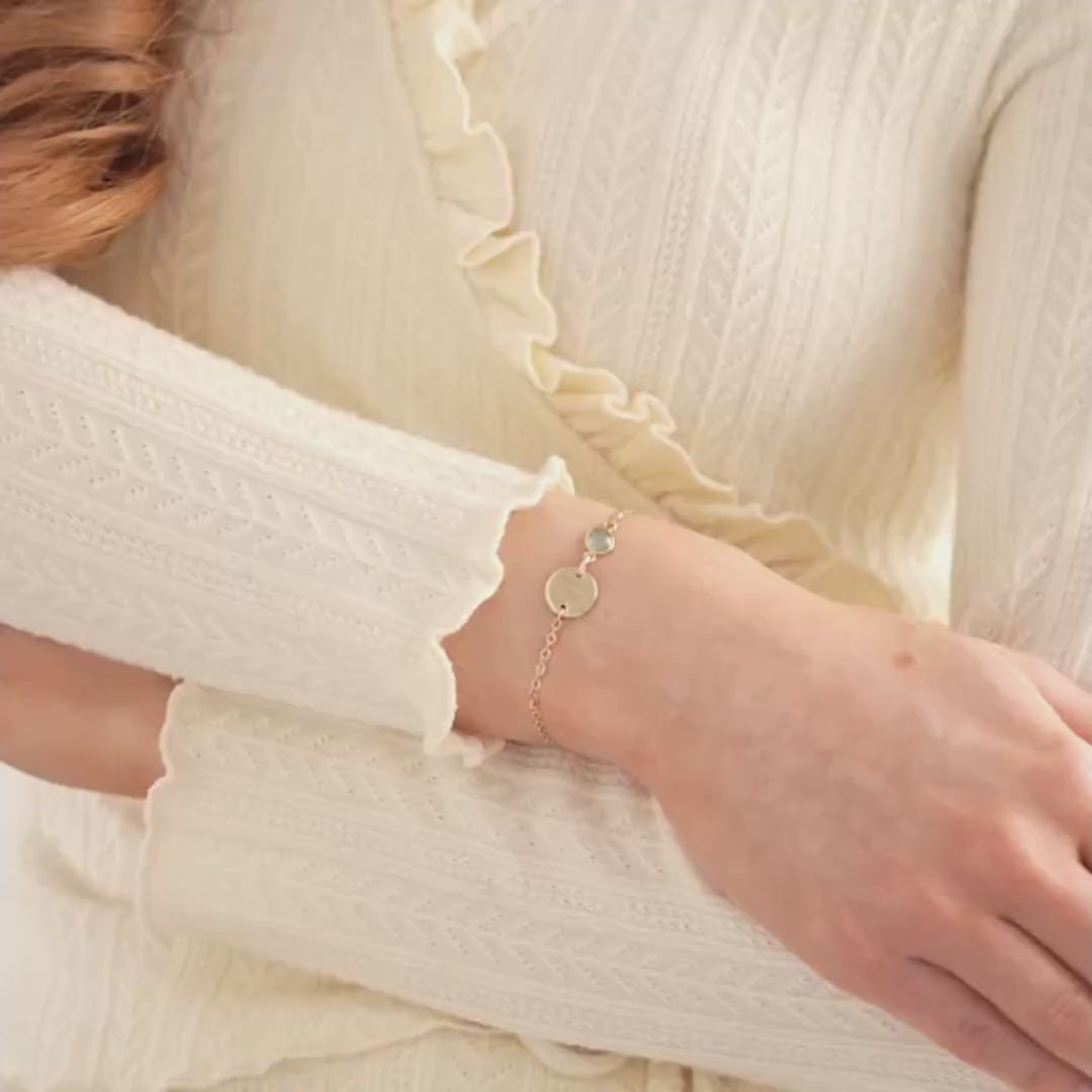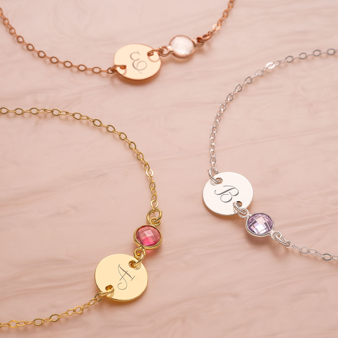 Indulge in luxury with our Rose Gold Personalized Initial Disc and Birthstone Bracelet. Crafted with a delicate initial disc and sparkling birthstone, this bracelet is a uniquely personal and sophisticated accessory. Express your individuality and elevate any outfit with this exclusive piece.