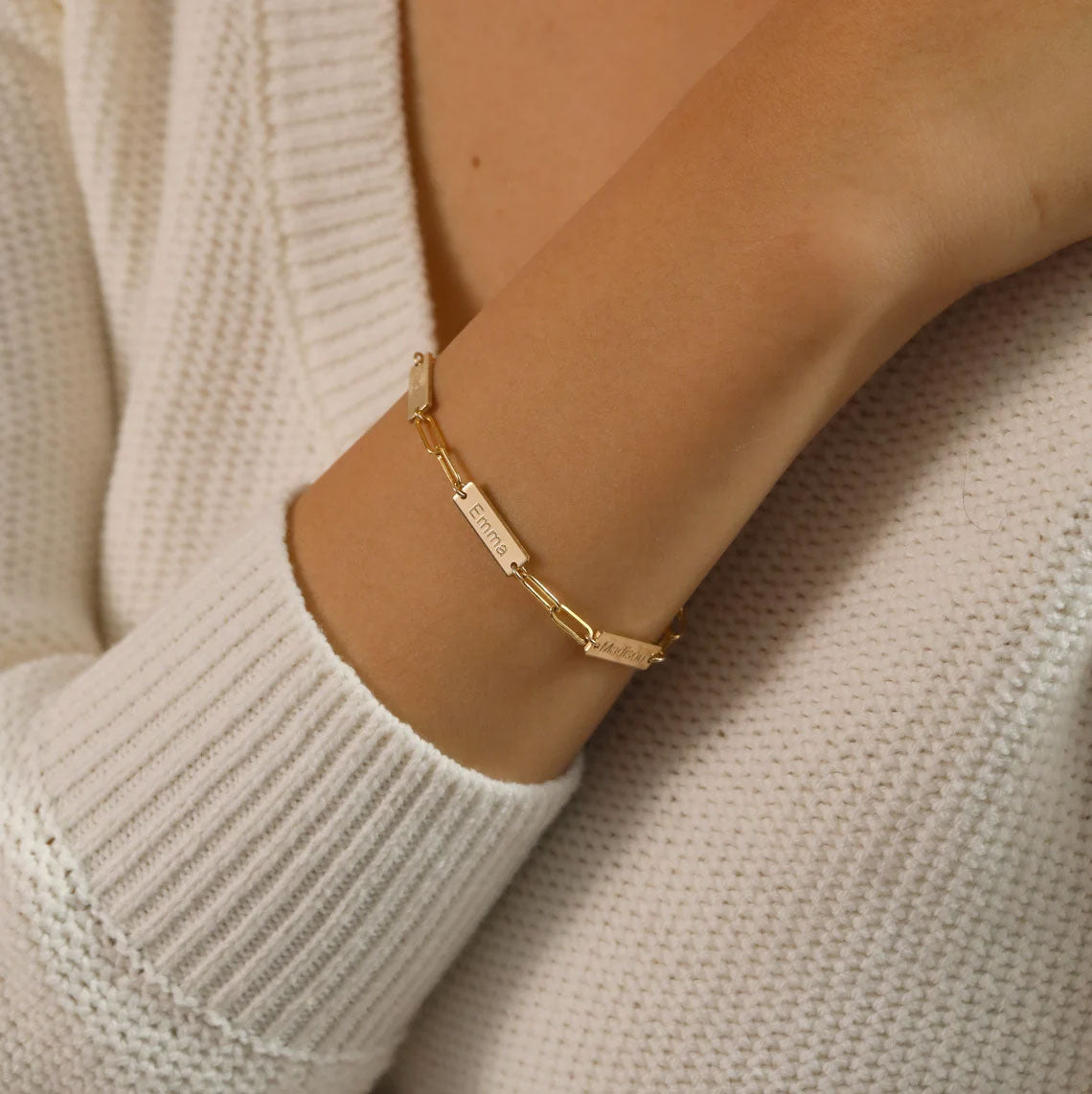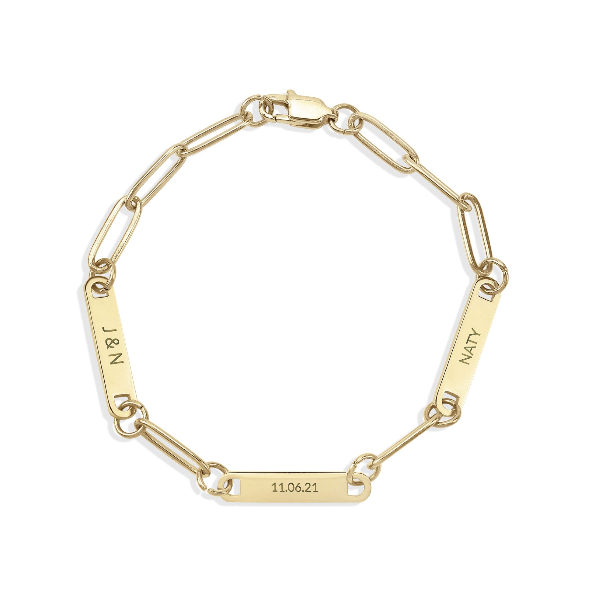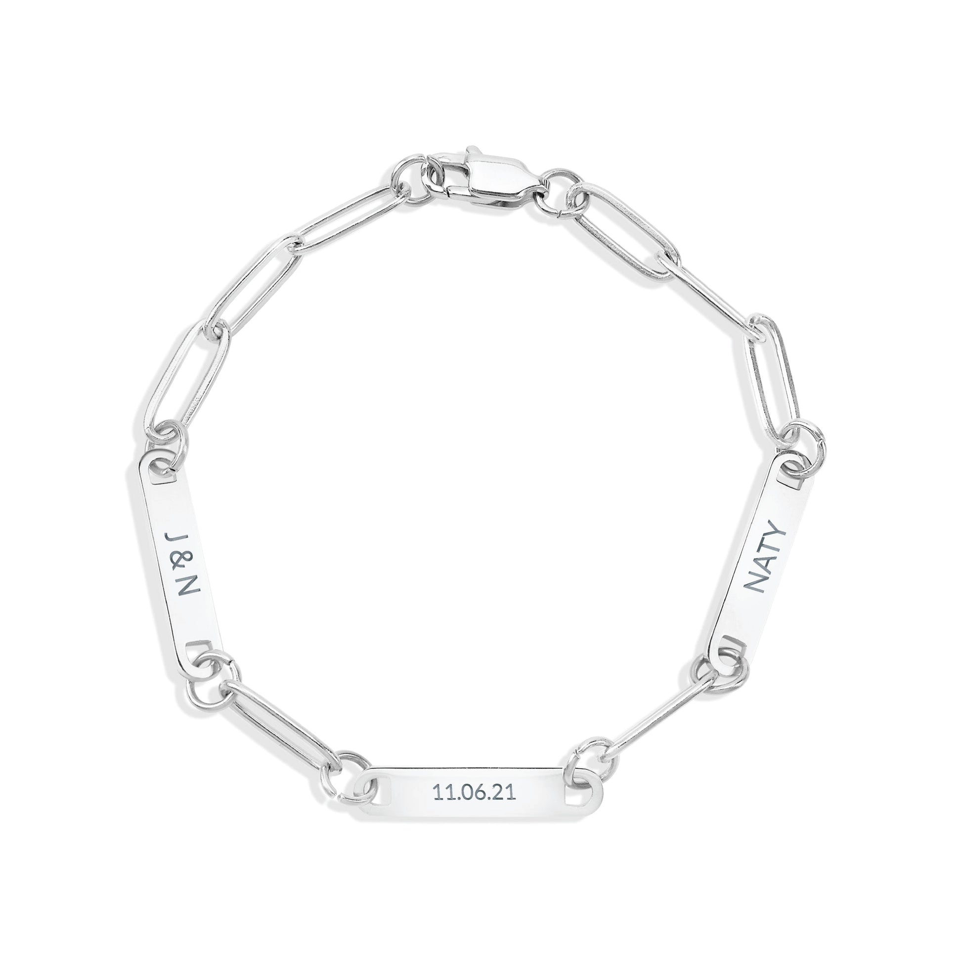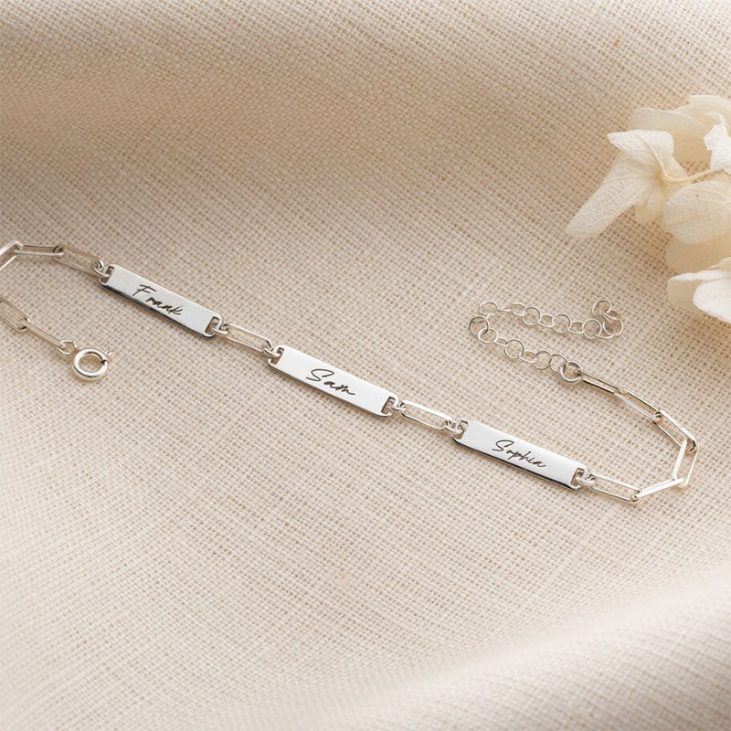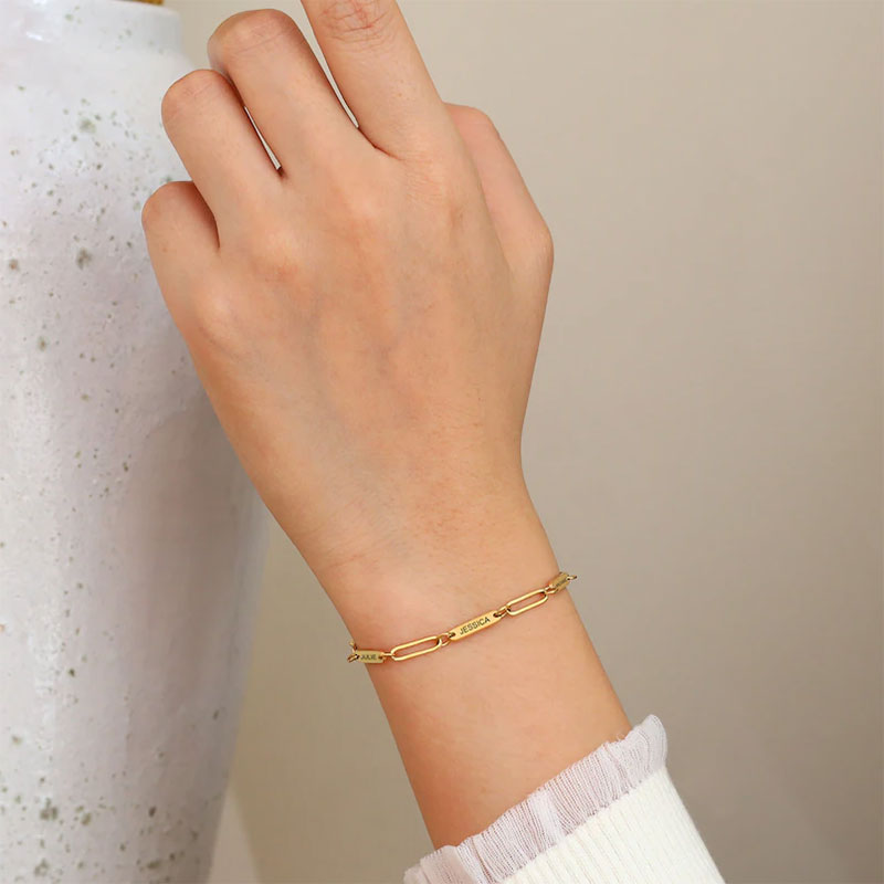 Customize your style with our Personalized Paperclip 3 Bar Bracelet! Featuring a trendy paperclip design, this bracelet allows you to add up to 3 customized bars engraved with names, initials, or meaningful words. Perfect for adding a personal touch to any outfit.