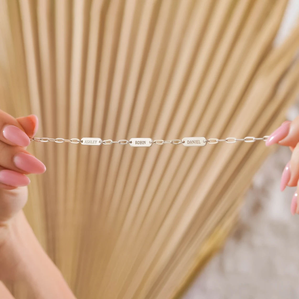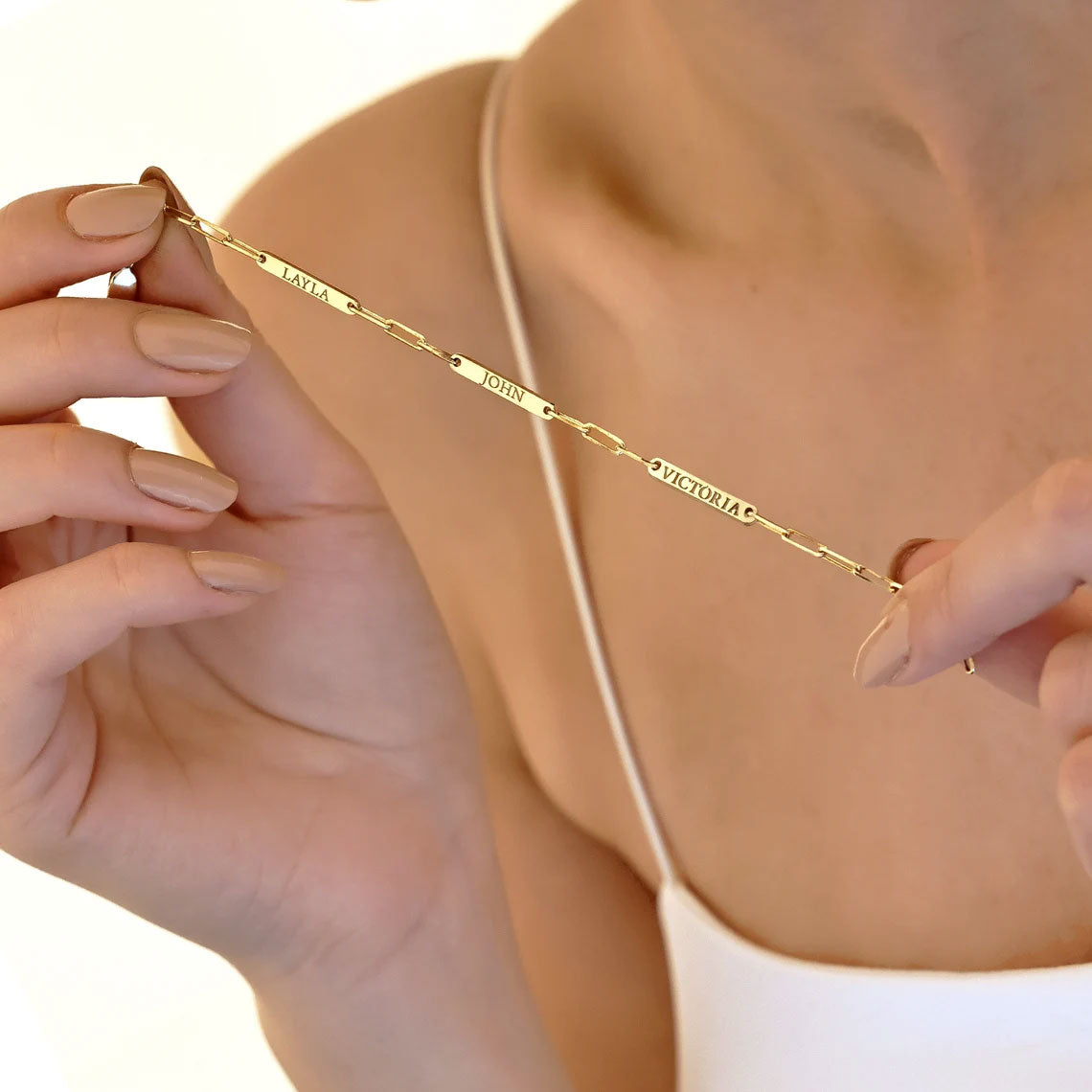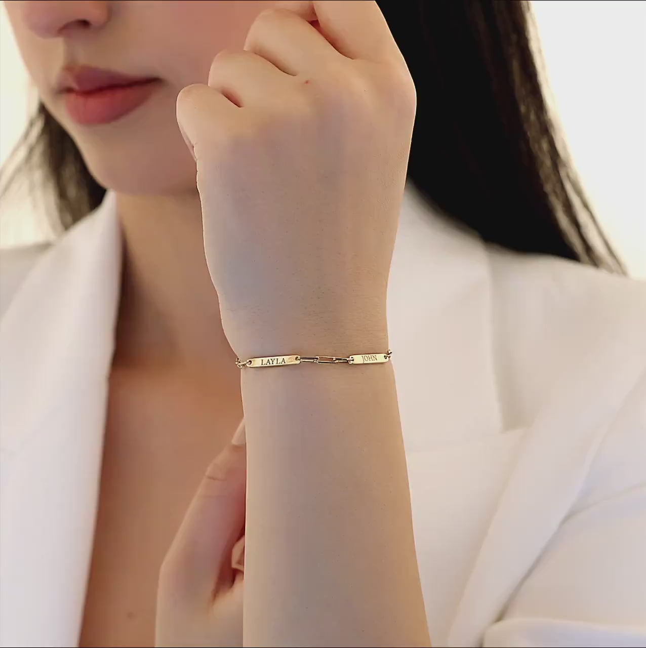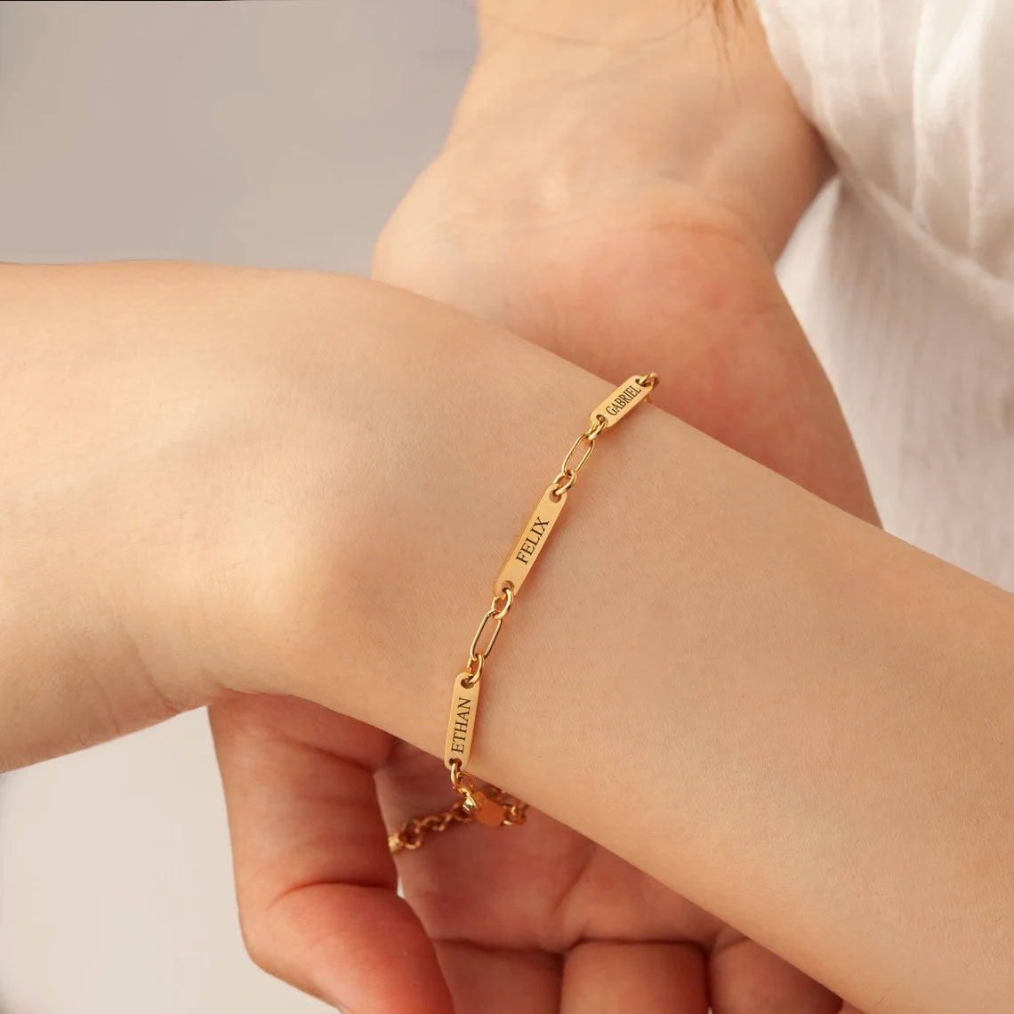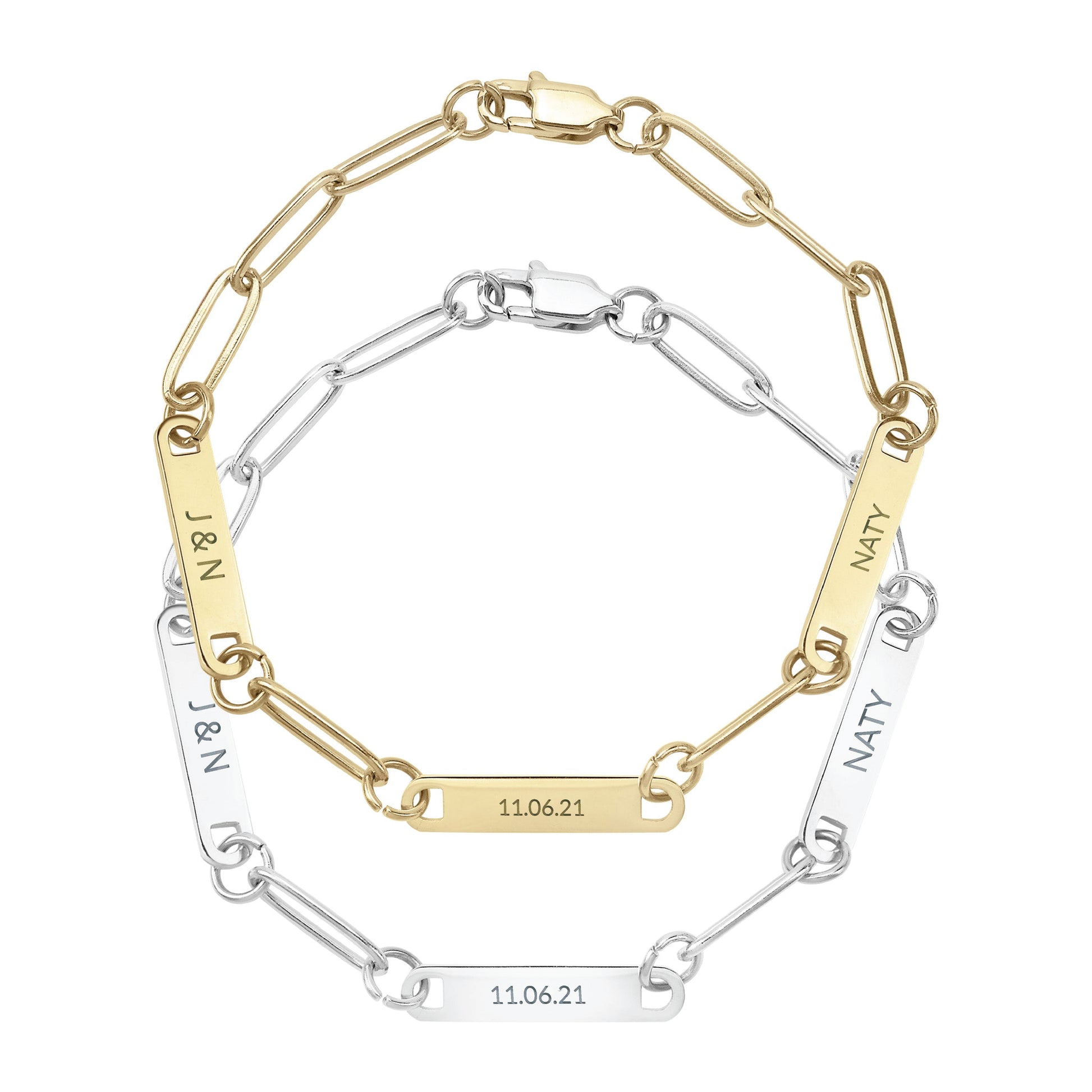 Customize your style with our Personalized Paperclip 3 Bar Bracelet! Featuring a trendy paperclip design, this bracelet allows you to add up to 3 customized bars engraved with names, initials, or meaningful words. Perfect for adding a personal touch to any outfit.
