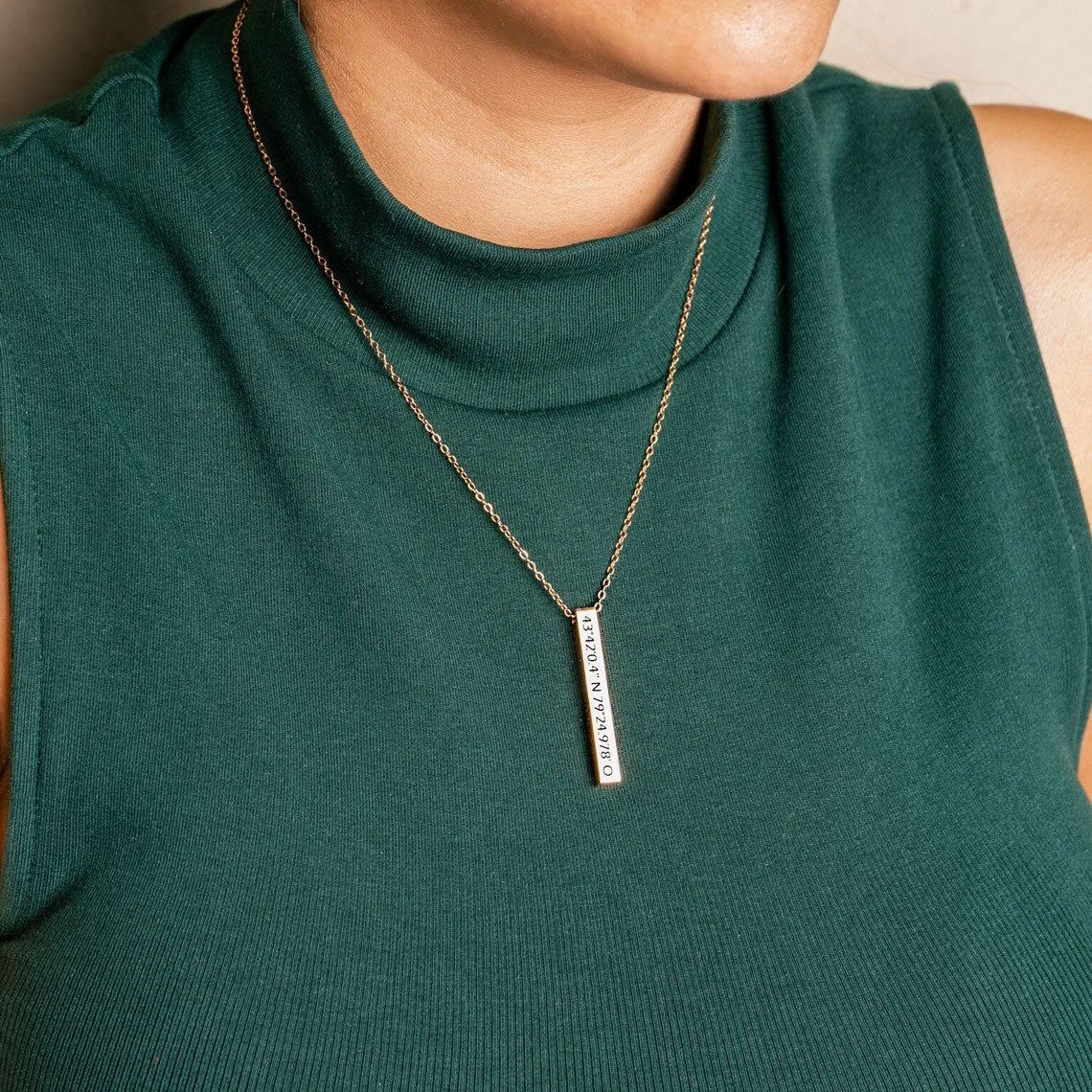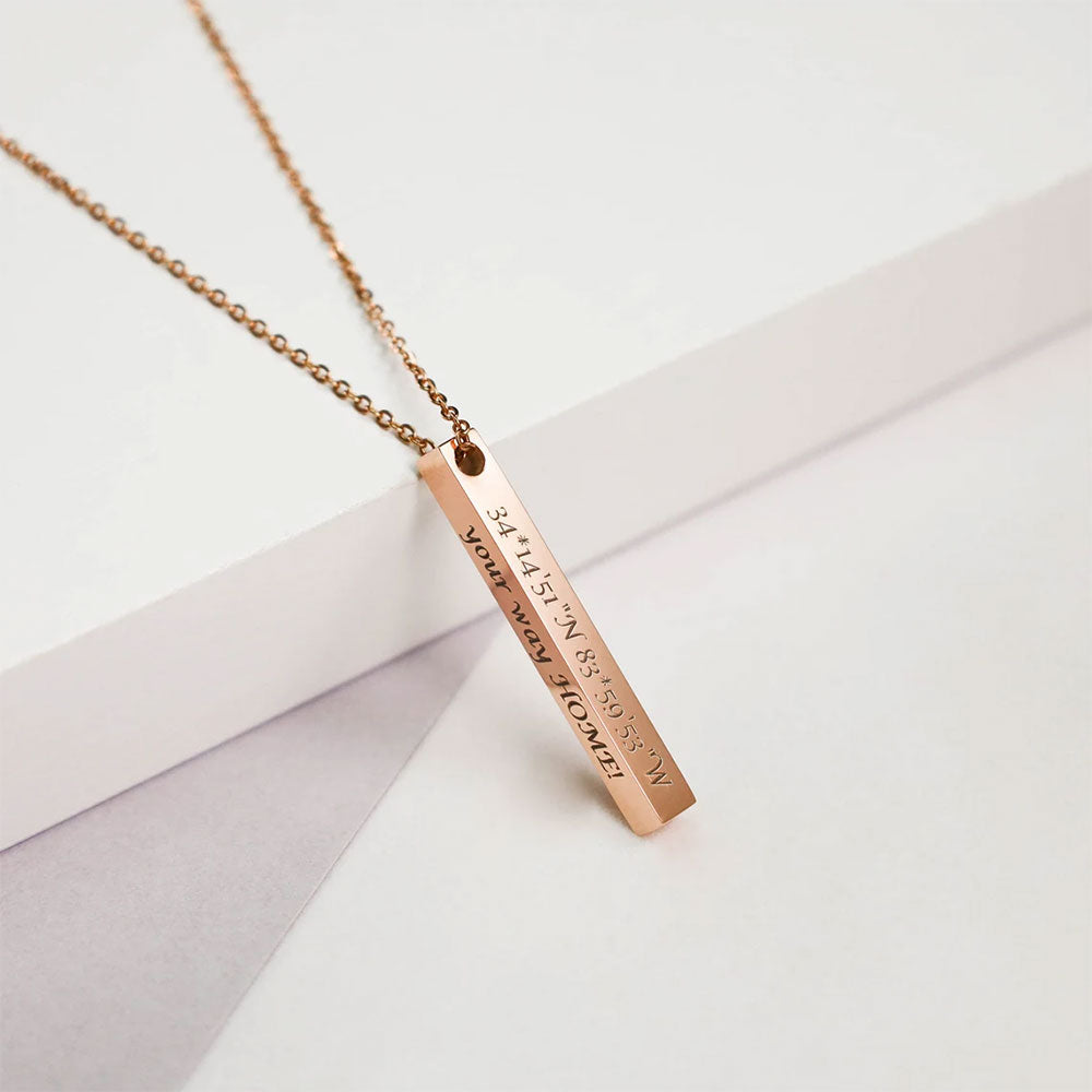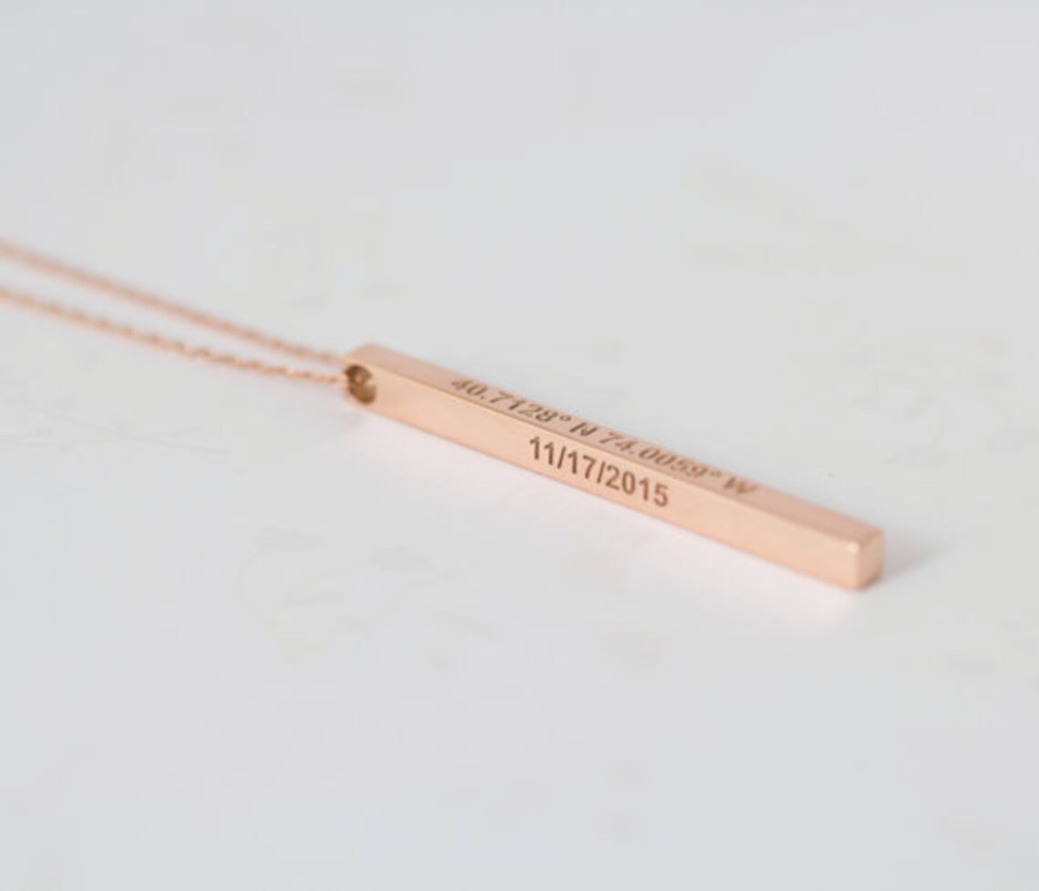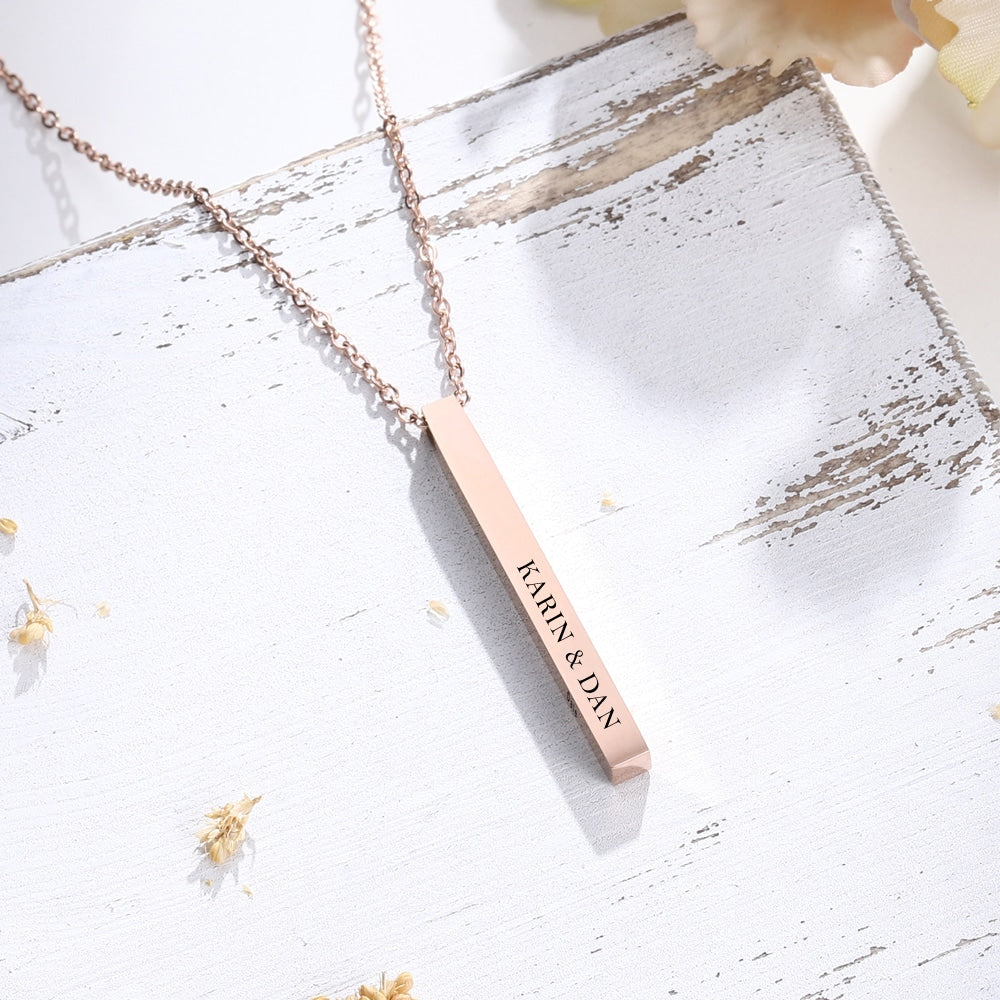 Elevate your style with our Vertical Engraved 3D Bar Necklace in Rose Gold! Personalize this sleek and modern piece with a meaningful name, date or message. Handcrafted from high-quality materials, this necklace is a unique and timeless accessory. Make a statement and cherish your memories with this custom necklace! - step up your evening look or add a touch of sophistication to everyday wear with this stylish piece today!